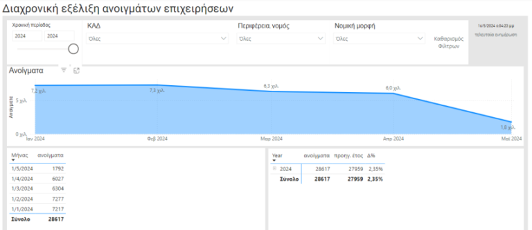 Ειδικά όσον αφορά στο τρέχον έτος, έχουν ανοίξει 28.617 επιχειρήσεις, έναντι 27.959 στο αντίστοιχο περσινό χρονικό διάστημα, καταγράφοντας αύξηση 2,35%.