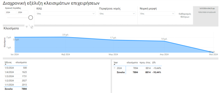 Στην Ελλάδα, τα κλεισίματα από τον Ιανουάριο ως τα μέσα Μάϊου έχουν περιοριστεί σε 7.894 και είναι μειωμένα κατά 10,44% σε σύγκριση με το αντίστοιχο περσινό χρονικό διάστημα. Από αυτά, τα 1.477 αφορούν σε επιχειρήσεις που δραστηριοποιούνταν στον τουρισμό και την εστίαση κι άλλα 2.125 στο εμπόριο.